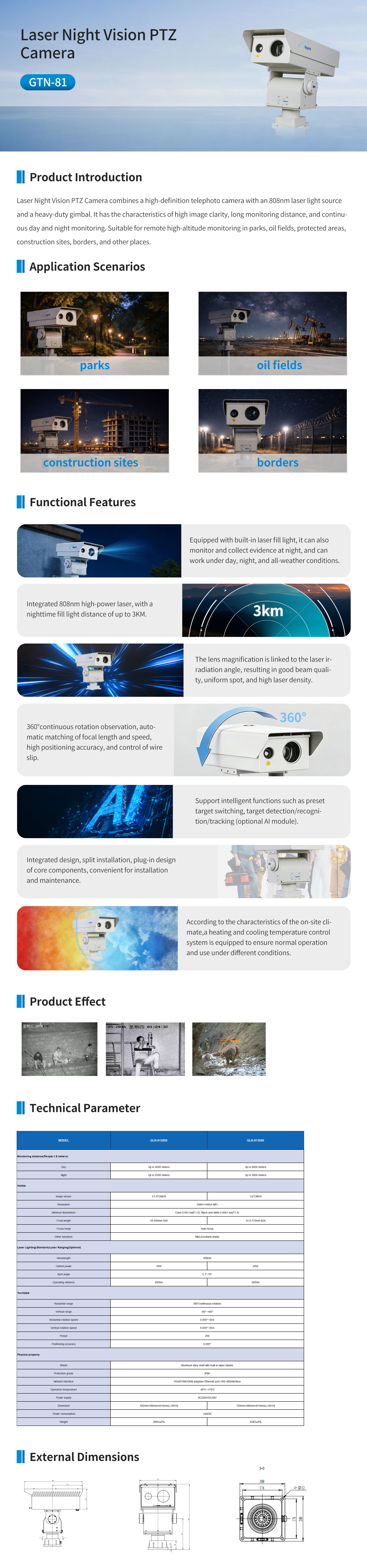 Laser Night Vision PTZ Camera combines a high-definition telephoto camera with an 808nm laser light source and a heavy-duty gimbal. It has the characteristics of high image clarity, long monitoring distance, and continuous day and night monitoring. Suitable for remote high-altitude monitoring in parks, oil fields, protected areas, construction sites, borders, and other places.