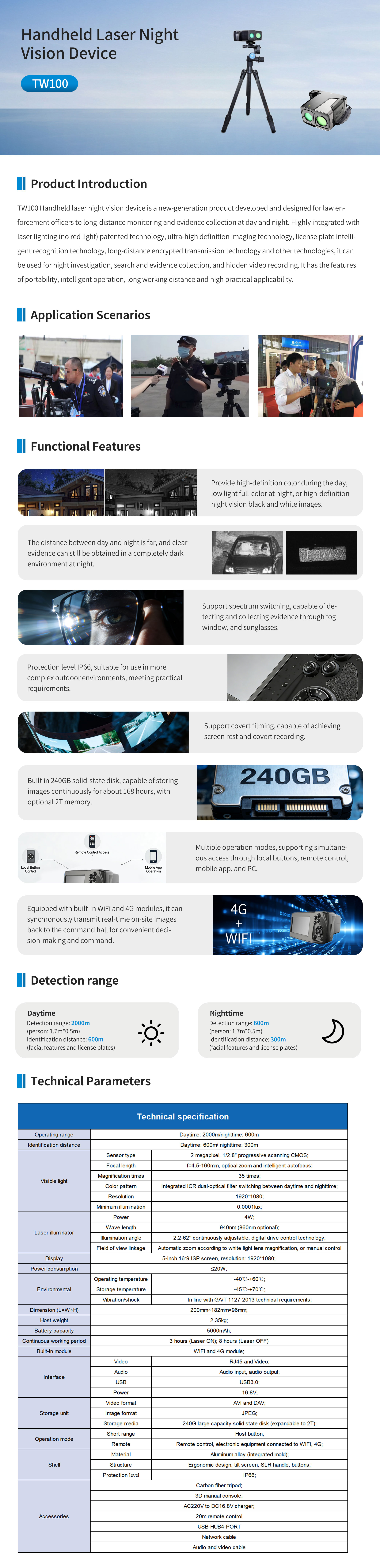 TW100 Handheld laser night vision device is a new-generation product developed and designed for law enforcement officers to long-distance monitoring and evidence collection at day and night. Highly integrated with laser lighting (no red light) patented technology, ultra-high definition imaging technology, license plate intelligent recognition technology, long-distance encrypted transmission technology and other technologies, it can be used for night investigation, search and evidence collection, and hidden video recording. It has the features of portability, intelligent operation, long working distance and high practical applicability.